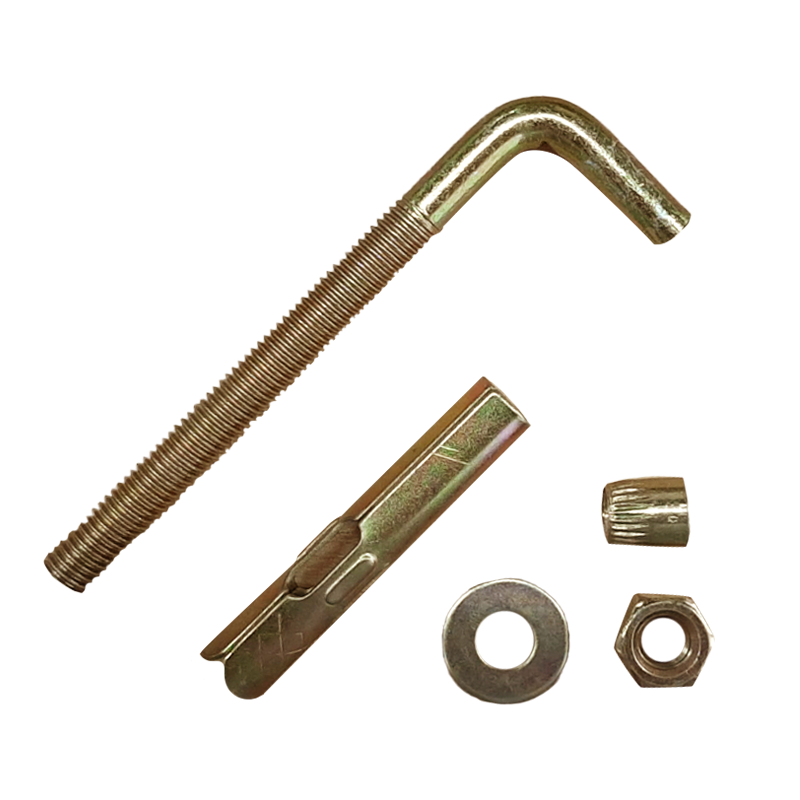 Анкерный болт с Г-образным так же называется "костыль", вместо шестигранной головки. При закручивании гайка подтягивает стержень, после чего конусообразный наконечник входит внутрь втулки и распирает ее, прижимая к стенкам отверстия. Используют для крепления в бетоне, камне, полнотелом кирпиче: радиаторов отопления, подвесных сооружений, строительных лесов. Используют для крепления тяжеловесных изделий к вертикальным поверхностям как высококачественная сталь для высоких вырывных нагрузок. Отлично держит нагрузку как в вертикальном, так и в горизонтальном положении крепления. Для затягивания анкерной гайки используется ключ или головка. Также анкер позволяет изменять высоту собранного с его помощью оборудования, конструкции и т.д. Обеспечивает возможность легкой регулировки уровня возникающих напряжений в конструкции в течение нескольких лет после монтажа. Стандартный анкер гайка является самым надежным и распространенным видом крепежа по бетону и кирпичу.