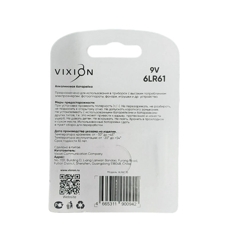 Батарейка алкалиновая 9V Крона 6LR61 1шт VIXION подходит для оборудования со средним и высоким показателем потребления энергии. Подаваемое напряжение может быть как постоянным, так и скачкообразным, а срок службы такой батарейки не зависит от того, как часто изделием будут пользоваться. Подойдет устройствам, где требуется питание 9В: компьютерное оборудование, плееры, фотовспышки, диктофоны, мультиметры, радиотехника, детские игрушки и прочее. Батарейка относится к щелочным элементам питания, по типоразмеру – к разряду Крона, часто путают с аккумулятором (отличаются емкостью). Рассчитана на более длительный срок хранения и службы, чем солевая батарейка. Vixion 6LR61 отличается малым коэффициентом саморазряда. Элементы питания способны годами храниться без использования, не теряя при этом заряд. Алкалиновые батарейки устойчивы к перепадам температуры и высоким нагрузкам. Функционируют даже при низких и высоких температурах, их режим работы от -20 до +54 С°.
