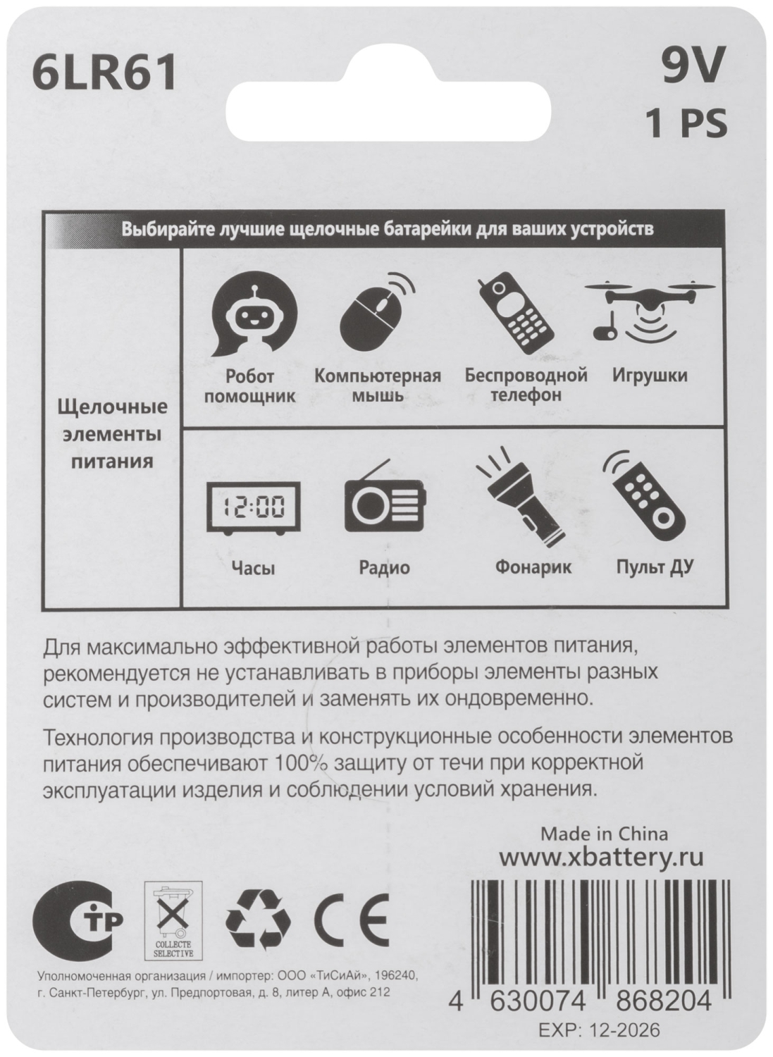 9 В, 600 мА/ч, 43-45 г <br/>Продолжительность работы 15 часов. Удержание заряда при 20 °С: после 12 месяцев хранения 90%, после 24 месяцев хранения 85%.