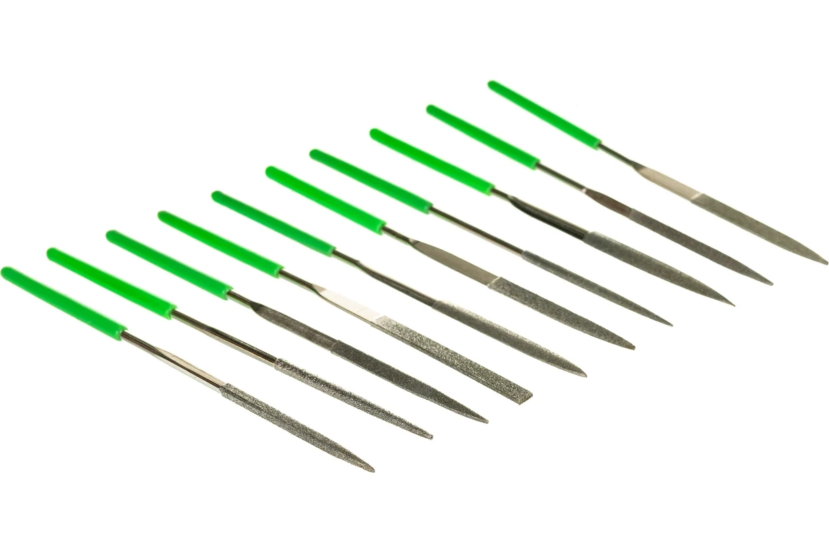 Набор алмазных надфилей Сибртех 158327 из 10 шт., 140 x 50 x 3 мм, предназначен для точных работ и используется для доводки и зачистки мелких деталей. Подходит для обработки металлических, стеклянных, керамических поверхностей. Набор универсален, т.к. в него входят надфили с разными сечениями профилей, что позволяет опиливать ровные поверхности, а также углы, пазы, отверстия, округлые выступы. Надфили пригодятся в слесарном деле, при занятиях моделированием, будут полезны и в быту. Преимущества Надфили изготовлены из высокоуглеродистой стали, поэтому характеризуются твердостью и износостойкостью. Напыление из алмазной крошки обеспечивает высокие абразивные свойства надфилей. Рукоятки обрезинены и не скользят в руке, что повышает комфорт по время работы. Зеленый цвет рукояток хорошо заметен, поэтому инструменты не затеряются в рабочем пространстве.