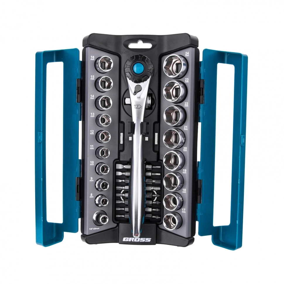 Набор торцевых головок. трещотка 120 зубьев. 36пр. 1/2" 3/8" CrV Gross