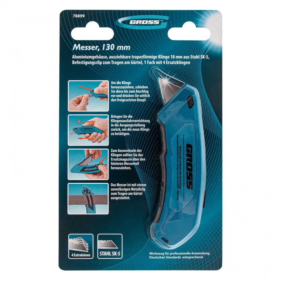 Нож 130 мм алюминиевый корпус, трапециевидное лезвие 18мм, 4 лезвия Gross