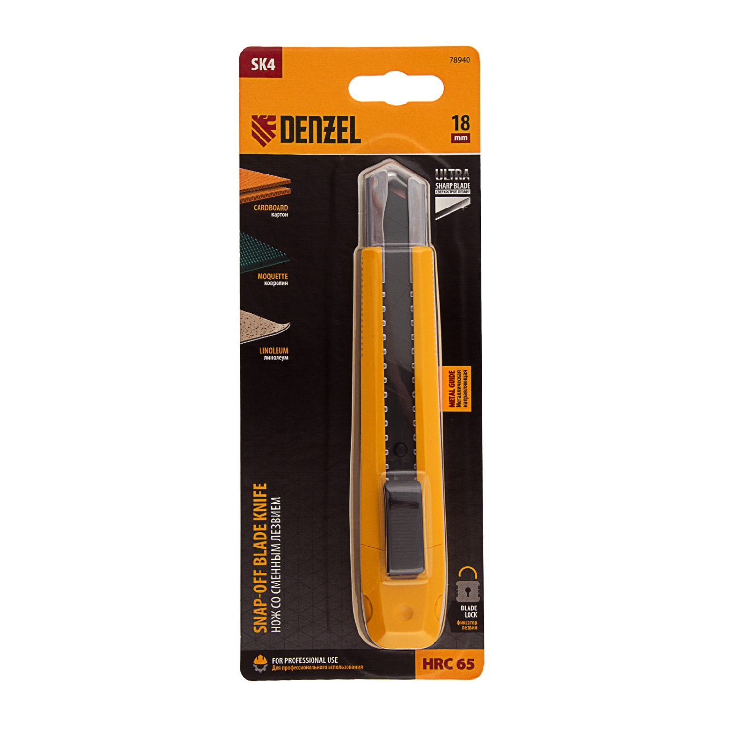 Нож, 18 мм, смен.лезв., SK4, мет.направляющая, нажимной фиксатор Denzel