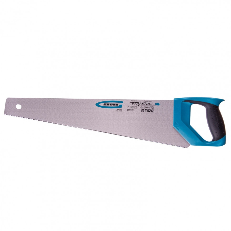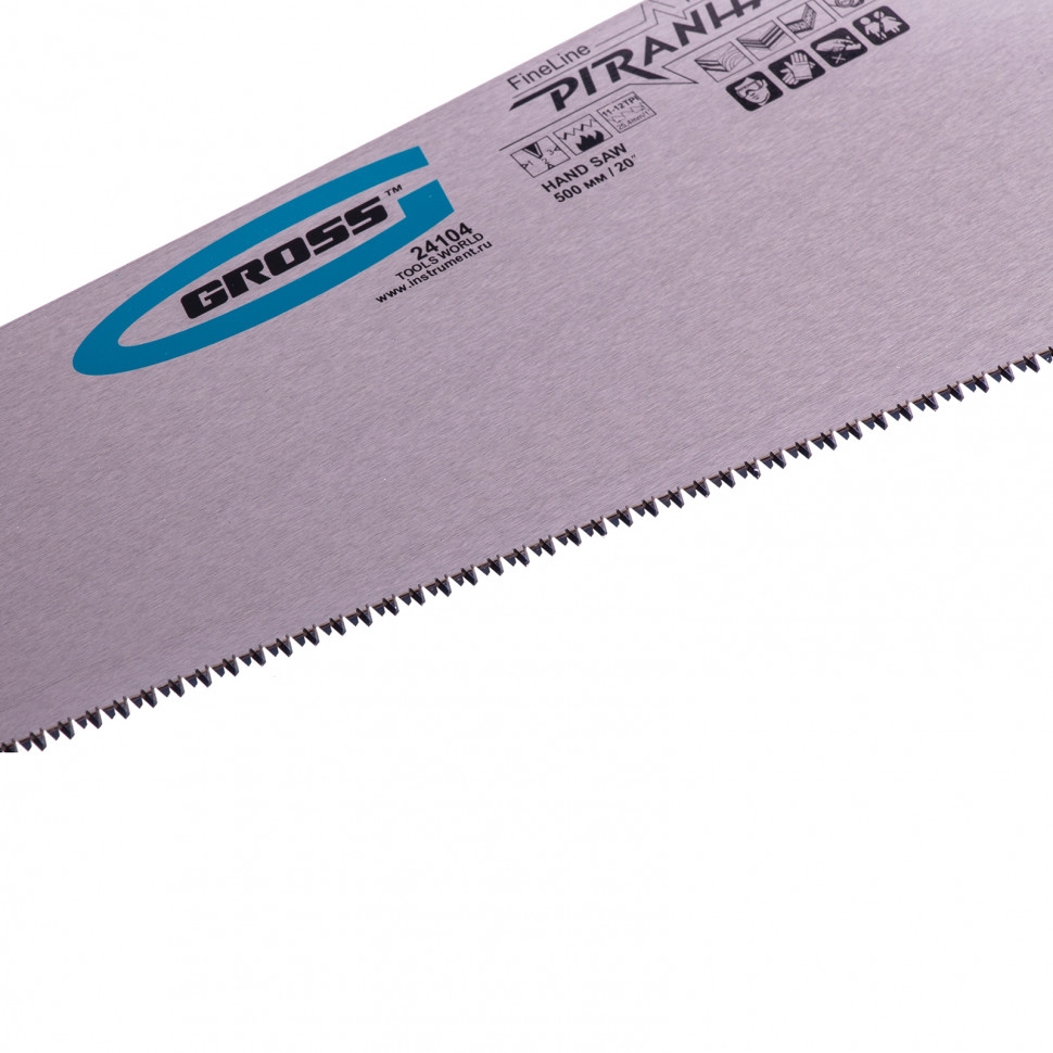 Ножовка по дереву Gross PIRANHA 24104 с полотном длиной 500 мм, калеными зубьями с 3D-заточкой и шагом 11-12 TPI, 2-компонентной рукояткой, предназначена для распиловки заготовок из древесины, ДСП, ДВП, МДФ и ламината, а также из пластических материалов, таких как пенополистирол и полиуретан. Может производить продольный и поперечный распил. Мелкие зубья с шагом 11-12 TPI позволяют выполнять точный и чистый рез. Ножовка обладает высокой производительностью благодаря трехгранной заточке зубьев. Инструмент используется в столярном деле. Полотно изготовлено из японской стали SK-5, обладающей высокими прочностными характеристиками.