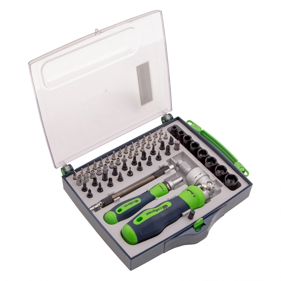 Биты: SL3, SL5, SL6, PH0, PH1, PH2, PZ2, T6, Т10, Т15, Т20, Т25, Т30, H4, H5, H6, SP4, TW 2,3 . 61 предмет из стали CrV, — это универсальные инструменты для частных и профессиональных мастеров. Отвертка с поворотной головой позволяет осуществлять монтаж/демонтаж крепежа в труднодоступных местах, а отвертка для точных работ пригодится при ремонте техники и приборов с микровинтами. Насадки из хромованадиевой стали обладают высоким ресурсом и износостойкостью, поэтому рассчитаны на интенсивную эксплуатацию. Реверсивный механизм повышает удобство эксплуатации, позволяя работать одной рукой. Обе отвертки оснащены двухкомпонентными рукоятками, посредством чего обеспечивается надежный хват без проскальзывания инструмента. Набор удобно брать на выездные работы, т.к. он продается в пластиковом кейсе с ручкой для транспортировки.