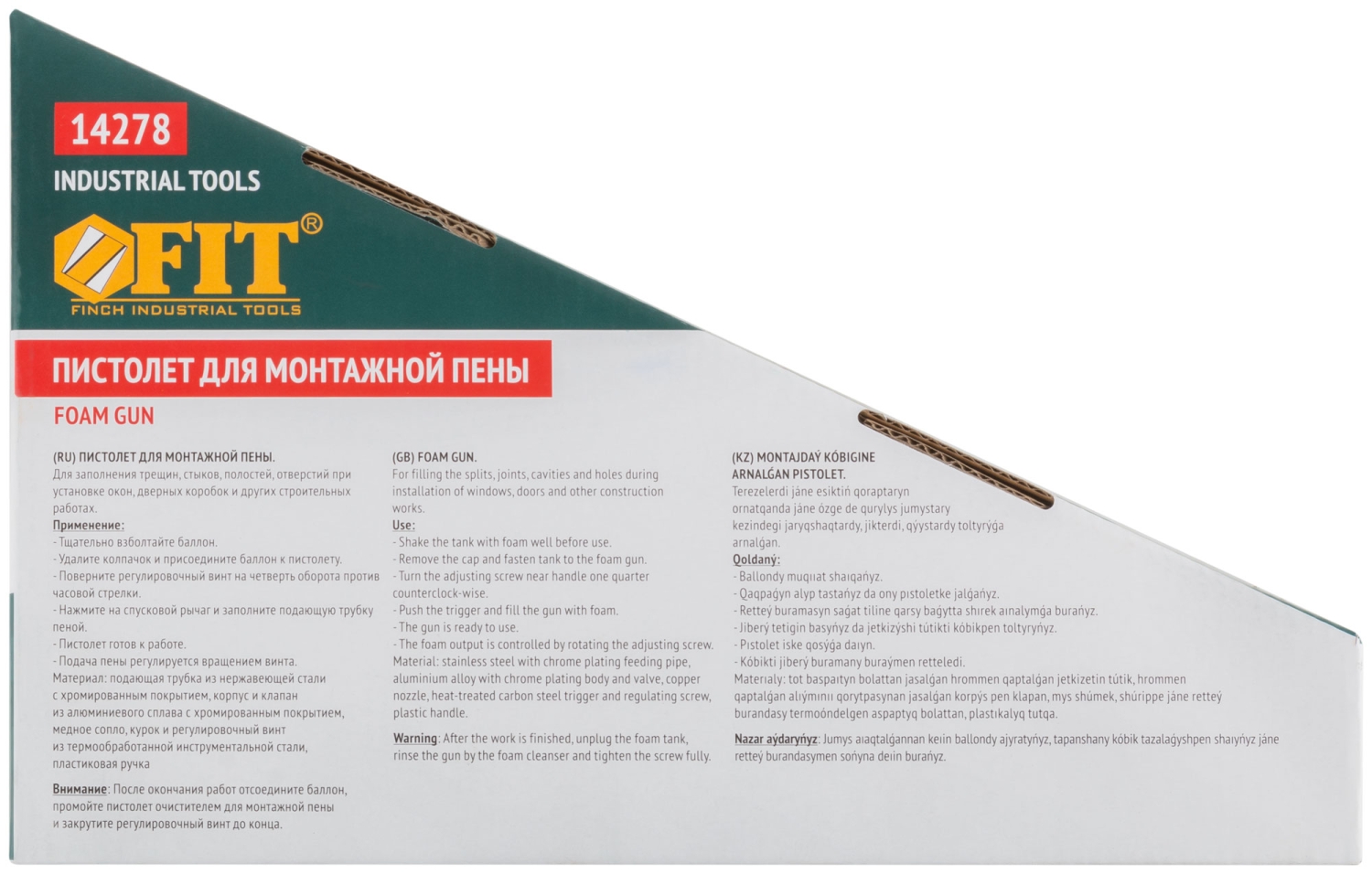 Пистолет для монтажной пены, алюминиевый корпус. Материал: подающая трубка – нержавеющая сталь с хромированным покрытием, корпус и клапан - алюминиевый сплав с хромированным покрытием, сопло – медь, курок и регулировочный винт – инструментальная сталь, пластиковая рукоятка. Упаковка: цветная коробка.