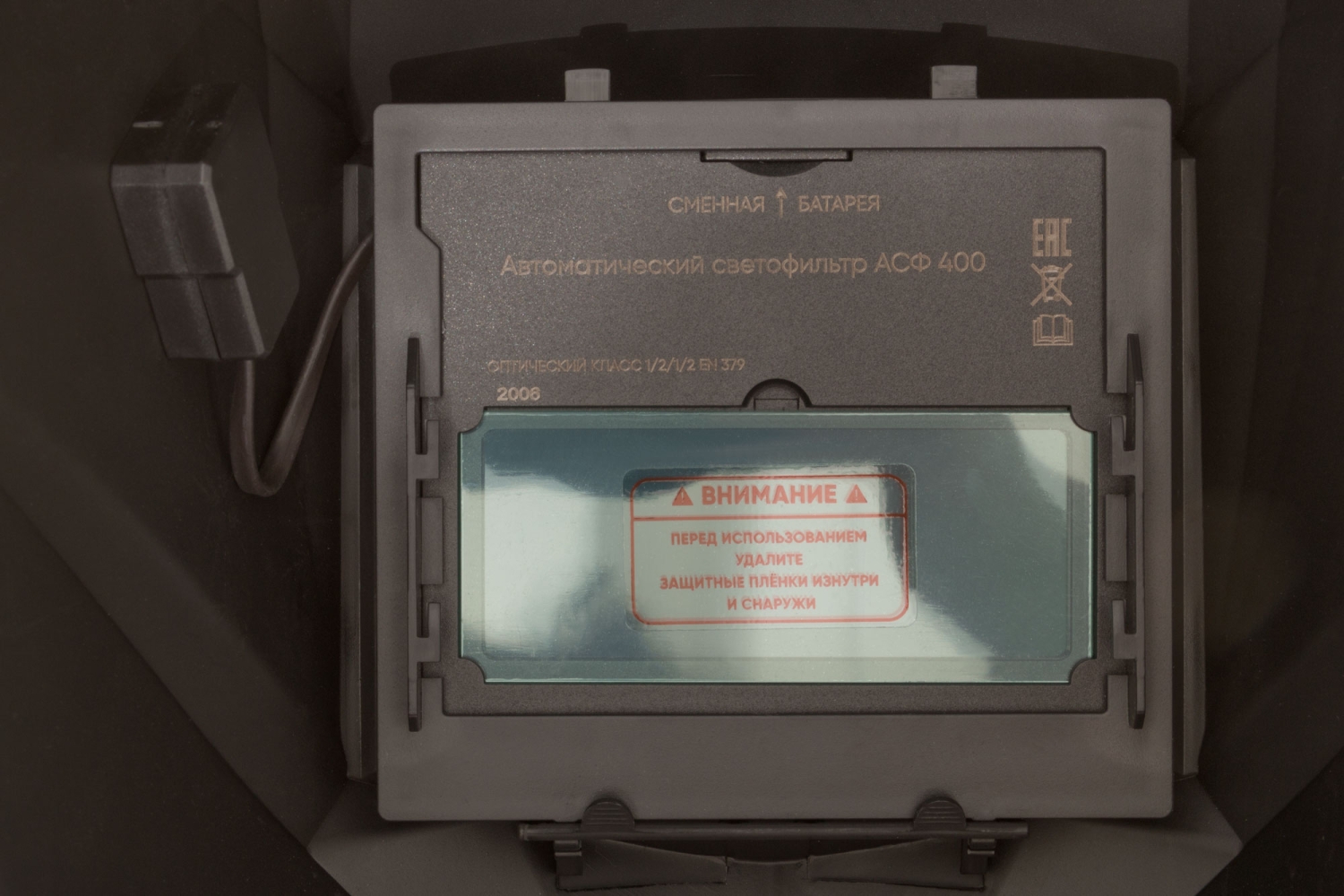 Щиток сварщика с автоматическим светофильтром "Хамелеон" АСФ-400, плавная регулировка затемнения. Для защиты глаз и лица от вредного воздействия излучения сварочной дуги во время проведения сварочных работ. Оголовье с храповым механизмом и регулировками по 3 направлениям. Светофильтр с автоматическим затемнением (в режиме ожидания DIN 4). 12247 - светофильтр с плавной регулировкой степени затемнения в диапазоне DIN 9-13, режимом шлифовки/резки и сменной литиевой батареей (CR 2032). 12248- светофильтр с 3 плавными регулировками (затемнение DIN 9-13, чувствительность, время задержки) и сменной литиевой батареей (CR;2032). Материал: АБС-пластик. Упаковка: картонная коробка.
