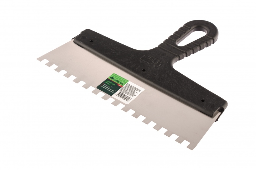 Шпатель Сибртех 85474 шириной 250 мм, из нержавеющей стали, с пластмассовой ручкой и зубьями 8 х 8 мм, применяется для равномерного нанесения клея при укладке мелкоформатной плитки, мозаики и т.д. Квадратные зубья облегчают нанесение клеевого состава, позволяя ровно и экономно распределять его по поверхности. Зубья размером 8 х 8 мм рассчитаны на плитку площадью 400-900 см2.