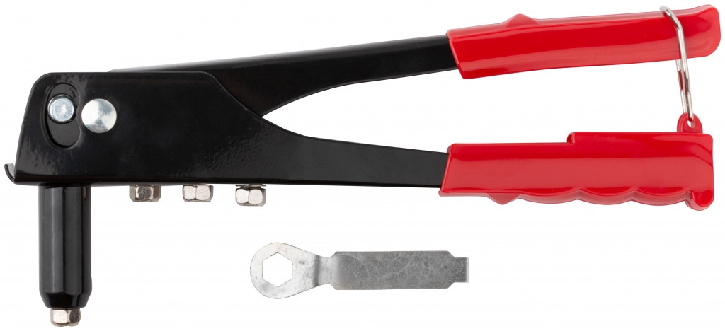 Для крепления вытяжных алюминиевых заклепок. 4 быстросменных насадки, пружинный рычаг для выброса сердечника от заклепок. Материал: инструментальная сталь, рукоятка с покрытием из ПВХ пластика. Упаковка: блистер.